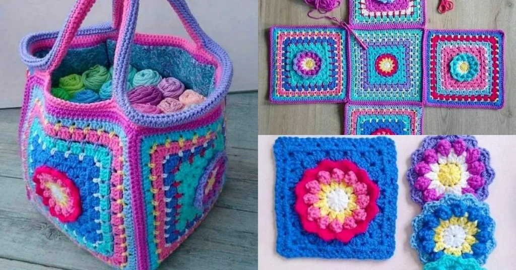 A bag made with squares of crochet flowers is a beautiful and unique handmade accessory that combines creativity and practicality.