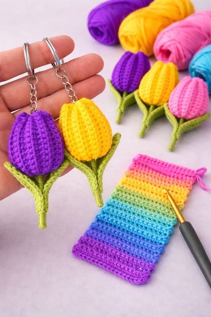The popularity of the Crocheted tulip keychain has grown rapidly among craft enthusiasts because it combines functionality with artistic expression. Handmade keychains are not only affordable and customizable, but they also make thoughtful gifts for friends and family. With just a small amount of yarn, a crochet hook, and basic stitches, you can create a miniature floral design that looks impressive and professional. This project is perfect for using leftover yarn, experimenting with colors, and practicing shaping techniques that are useful for other crochet patterns as well.
